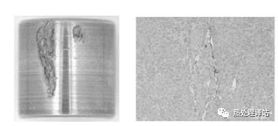 图11 81212轴承滚子的典型失效外观(左)和垫圈内出现的白蚀裂纹(滚道下84um处的横截面)(右)