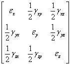 作为一个材料人,必须要掌握材料的基本力学性质,包括应变、应力以及相互之间的关系等。需要了解材料在不同形式的力的作用下的对应的反应形式,并储备常用的材料的力学性质的知识。选择合理的数学模型,确定最终的物理方程,这都要求我们了解材料的基本力学性质。 材料的力学性质通常是由试验测定的。因此,力学性质分为单项加载情况下的力学特征、单项加载卸载的力学特征、循环加载时材料力学特征。其中,单项加载情况下获得的基本力学数据是比较基础的。进行相关的描述前,首先需要了解力学的基本概念,包括应变、应力。 所观察的物体的变化从物理上来讲主要包含位置的变化和形状的变化。位置变化可以通过旋转、平移来表达,形状的变化则是可以通过应变来表达。应变包括长度的变化和方向的变化。如下图所示,长度的相对变化为线应变,可以表示为: 方向的相对改变为剪(角)应变,如: 针对三维情形,可以获得应变张量如式: 需要说明的是,张量的剪切应变分量不等于实际的剪切应变。 图1 应变表达示意图 上述定义属于工程应变。工程应变取决于初始长度,如l,初始长度是事先已知的,所以工程应变是线性的。工程应变的应用局限于材料小旋转,中等大小的刚体旋转将导致非零应变。实际上,一切能够按照一定的规律表示形状变化的量均可以作为应变的度量(但应变的使用通常需要和应力产生极大的关联,方能产生实际价值,因此,需要针对所定义的应变度量建立相关联的应力度量,即共轭的应力定义)。所以,除了上述应变定义以外,还有其他一些比较重要的应变定义。一维问题中,对数应变由下面公式计算: 对数应变也可以泰勒展开如下式所示,其与工程应变存在一定的差别,因此,需要进行区别对待。在有限元程序编写时,特别是静强度分析时,通常为小应变状态,且所划分的单元较小,因此,两者的差别并不大。 对数应变是非线性应变,因为它是未知的最终长度的非线性函数。它同样可称为log应变。三维等效对数应变是Hencky应变。在大应变问题中,对数应变并不能自动适应任意大的旋转。 一维的Green-Lagrange应变由下式计算: 此应变是非线性的,因为它取决于未知的更新长度的平方。此种应变优于对数应变或Hencky应变之处在于,它可自动适应大应变问题中的任意大旋转。这在非线性分析中将会用到。常见的力学试验拉伸数据如下图所示。 仅从几何学的角度定义如上,直观易于理解,但实际应用过程中,这种纯粹几何的定义适应性较差,通常需要从解析几何的角度来进一步地考虑。因此,需要首先建立坐标系。 图2 位移示意图 OA和OB两线元的长度分别为OA=dx,OB=dy。设O点的位移是u(x, y) 和v(x, y),A 点的位移是u(x+dx, y)、v(x+dx,y), B点的位移是u(x,y+dy)、v(x,y+dy)。 则可以定义工程应变如下式所示。 可以看出,上述的位移的描述都是基于最初状态下的位形确定的,我们可以称为0时刻状态下的位形。显然位形发生变化可以通过上述的量进行表达。 那么,对数应变、Green-Lagrange应变应当如何表达呢? 如果我们观察物体上一个点的运动,它的初始位置是{X},最终位置是{x},它运动的量为{u}。 变形梯度也是物体变形多少的一个度量,它的定义是: 变形梯度F,可以过滤掉平动(在通过后续对数计算等可以将平动给过滤掉,实际上F在平动时应该为单位矩阵),剩余旋转、由于应变造成的形状改变。通过矩阵的极分解,可以获得去除了旋转变换后的形状变形。 对数 (Hencky) 应变可由下式计算: 这里对数应变是以矩阵形式表示的应变张量。在三维问题中,Green-Lagrange 应变可直接由拉伸矩阵计算出,如下式所示: 这种应变在计算时直接忽略了旋转矩阵,则可以从变形梯度的形式写出,如下式所示,前两项是线性小应变项,最后一项是应变的非线性项。 当然以上的形式可以通过变形前的坐标进行表示,也可以通过变形后的坐标进行表示。更新拉格朗日应变即为ALMANSI应变。此外,常用的概念还有体积应变。