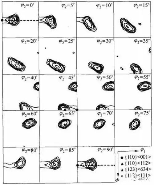 极图和反极图是用二维图形来描述三维空间的取向分布,它们都有局限性。而采用空间取向g(φ1,Φ,φ2)的分布密度f(g)则可以表达整个空间的取向分布,这称为空间取向分布函数(ODF)。ODF是根据极图的极密度分布计算出来的三维图形,由于用立体图表示不方便,一般用固定φ2的一组截面来表示,图3就表示工业纯铝经95%形变量冷轧后的ODF图。