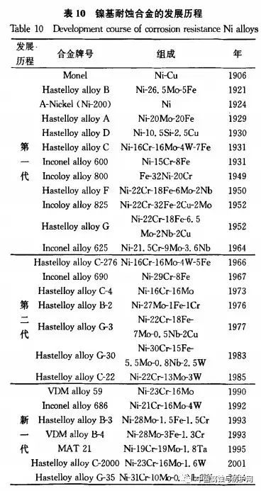 1930年Haynes国际公司开发了Ni-Mo合金B和Ni-Cr-Mo合金C.Ni合金发展的下一个重要阶段来自于Inco公司,1931年开发出了Ni-Cr-Fe合金600,1949年开发出了Ni-Fe-Cr合金,分别命名为Ineonel和Incoloy.20世纪70年代各国生产的耐蚀合金牌号已近50种,其中产量较大、应用较广的有Ni-Cu、Ni℃r、Ni-Mo、Ni-Cr~Mo(W)、Ni-Cr-Cu、Ni-Fe-Cr和Ni-Fe-Cr-Mo等合金系列,共10多种牌号。20世纪七八十年代,耐腐蚀合金性能得到了突破性的发展。