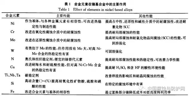 镍在碱类溶液中完全稳定,对活泼气体(如氟、氯、溴以及它们的氢化物)、氢氧化物(如NaOH、KOH)、一些有机物的耐腐蚀能力优良。合金元素在镍基合金中耐水溶液腐蚀的主要作用见表1。