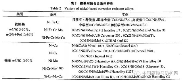 研究表明合金元素改善合金腐蚀抗力的效果,来自镍合金表面所形成的钝化膜的稳定性。镍基合金中镍含量都在30%以上,其中W(Ni+Fe)≥50%的称为铁镍基耐蚀合金,W(Ni)≥50%的称为镍基耐蚀合金,在实际使用中都可以被认为是镍基耐蚀合金,其分类如表2所示。