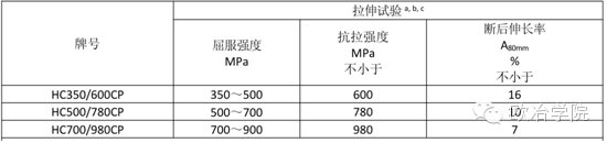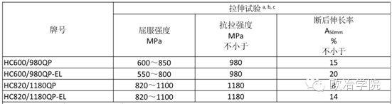 再往里,我们可以看到汽车的车身结构件,如下图所示。它与汽车的安全和轻量化息息相关。因此选材需要既有高强度,又有高塑性。先进高强度钢(AHSS)由于具有较好的强塑性结合、良好的碰撞特性和更高的疲劳寿命,多被用在车身结构件上。比如它在前、后保险杠骨架以及A柱、B柱等重点部位得到了广泛的应用,在发生撞击时,尤其在正面和侧面撞击时,可有效减少驾驶舱变形,保护驾乘人员的安全。先进汽车高强度包括双相钢、马氏体钢、相变诱导塑性钢、复相钢、淬火延性钢。典型的力学性能见文末附表1所示。