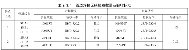 GB50235《工业金属管道工程施工规范》和GB50184《工业金属管道工程施工质量验收规范》体系将工业管道分为分为Ⅰ、Ⅱ、Ⅲ、Ⅳ、Ⅴ五个等级,这种分法所执行的原则与GB20801并不相同。而后,按下表确定无损检测比例: