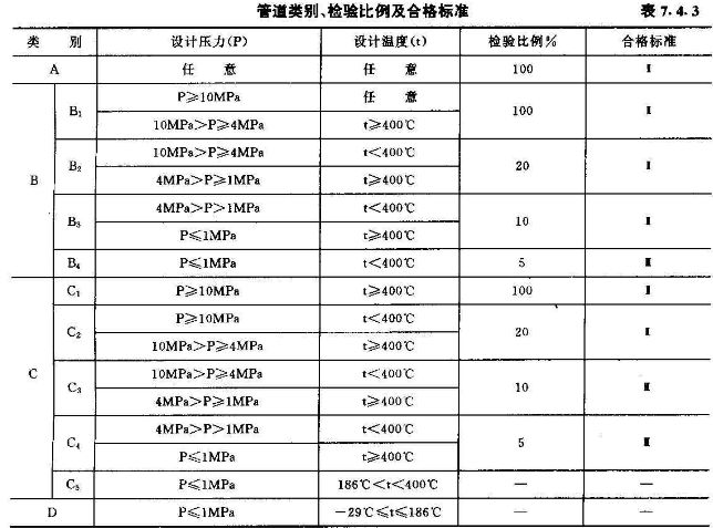 GB50316《工业金属管道设计规范》体系参考ASMEB31.3的做法,把工业管道分为A、B、C、D四类,按下表确定检验级别: