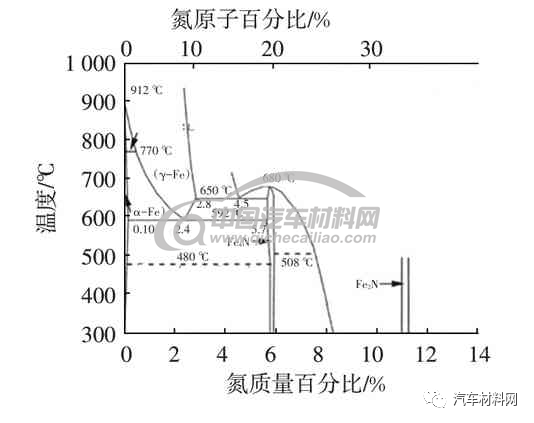 表2 简单总结了渗氮过程及相变序列,渗氮层形成时,含氮铁素体(α-Fe(N))未达到饱和,随渗氮时间延长而增厚;随活性氮原子[N]原子的渗入和扩散,N 原子达到饱和发生相变,形成含氮奥氏体(γ-Fe(N)),以及奥氏体的相变,α-Fe(N)→γ-Fe(N)→γ′ -Fe4N;当γ′ 相达到过饱和状态时,形成含N 量更高的ε相(Fe2-3N)。最后渗层主要由γ′相和ε 相组成的化合物以及含氮铁素体组成的扩散层组成,在奥氏体渗氮过程中的渗层中还会存在由γ-Fe(N)组成的介于化合物层和扩散层之间的过渡层。碳氮共渗和渗氮的机理基本是相似的,但由于碳的加入,使表面形成的相更为复杂,目前对于Fe-N-C 三元相图,还没有明确的铁素体碳氮共渗和奥氏体碳氮共渗的温度划分点。
