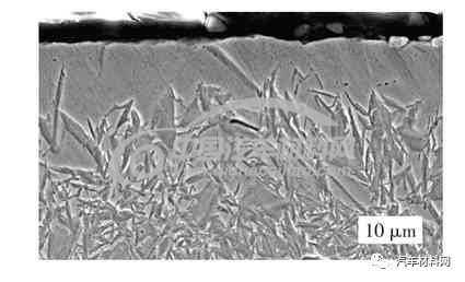 温度偏低和气氛浓度不足时会造成γ′相生长不充分。当温度<590 ℃时,图7 表层化合物未覆盖完全,最厚处约6.3 μm,并且γ′相层下没有γ相的共析类组织;图8 中黑色的片条状物质为马氏体加残余奥氏体,是奥氏体的过冷组织,由于氮气的气氛不足所造成,因为有奥氏体的分解产物,说明该工艺过程中温度>590 ℃。从浓度角度考虑,表层的间隙化合物为γ′相,不是ε相。