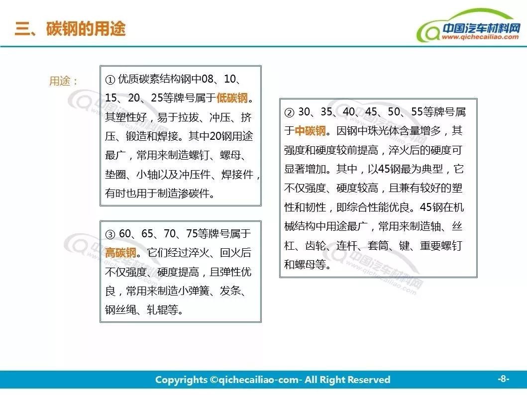普通碳素结构钢:普通碳素结构钢的标准是GB/T 700--2006。它对碳含量、性能范围以及磷、硫和其他残余元素含量的限制较宽。普通碳素结构钢分为三类:甲类钢(A类钢)是保证力学性能的钢;乙类钢(B类钢)是保证化学成分的钢;特类钢(C类钢)是既保证力学性能又保证化学成分的钢。