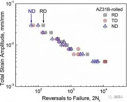 人们研究最多的就是织构对材料静态力学性能的影响,图4表示的是一种商业镁合金在搅拌摩擦焊工艺的影响下产生强烈的基面织构,从而材料的不同部位不同方向的拉伸性能就表现出差异。比如以经过摩擦焊(FSP)工艺处理的样品为例,材料在样品宽度方向也就是横向(TD)的拉伸强度要显著高于加工方向(PD),表现出显著的各向异性。