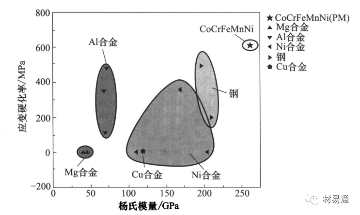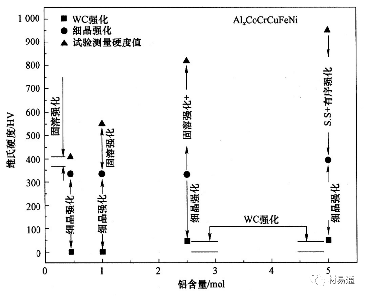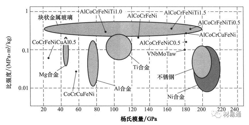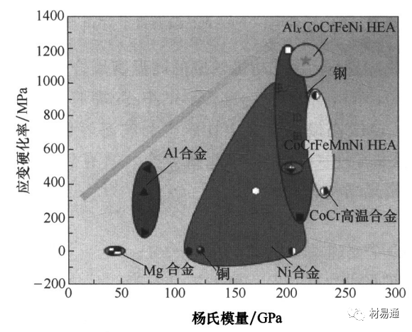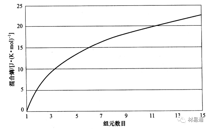 传统合金:以1~2种金属为主,并通过添加特定的少量其他元素,采用不同工艺来获得不同性能的合金。由于传统合金中合金成分的自由度较低 ,根据吉布斯相律,增加组成合金的金属种类,合金内部会析出大量结构复杂的脆性金属间化合物或中间相,导致合金性能恶化,给材料的组织、成分分析带来极大的困难,从而使得材料中的特殊微观结构消失以及力学性能受到限制。高熵合金的出现打破了传统合金以一种或两种金属元素为主的设计理念。 高熵合金的定义: 高熵合金(High-Entropy Alloys)简称HEAs。是一类具有优异性能的新型材料,以其优异的力学性能、耐腐蚀性能、优异的热稳定性等特点受到科学界广泛关注。高熵合金的“高熵”是指的是在原子尺度上的化学无序或者拓扑无序,即合金的原子排列混乱度高,处于一个无序状态。 高熵合金的发展历程如下: 德国科学家和冶金学家Franz Karl Achard在课题研究过程中,开展了一项创新性研究,他们制备了一系列包含5到7种元素的多组分合金。但不幸的是,这项意义非凡的工作几乎被世界各地的冶金学家所忽视。直到1963年,这项工作才被Cyril Stanley Smith教授(史密斯,1963年)注意到并进行了报道。由于科学家们对这项工作的忽视,导致了高熵合金发展的中断。 1993年,英国剑桥大学的科学家提出了著名的“混乱原理”,他认为合金材料的熵越高,越容易形成一种非晶态的结构。与此同时,台湾学者叶均蔚等人提出了新颖的合金设计思路,设计一种具有多个组元、高混合熵的合金,并为它命名为高熵合金。 直至2004年,英国的Cantor教授在熔炼一组髙混合熵的合金的时候发现,合金并没有形成预期的非晶态结构,反而出现了许多脆性的晶态相。实验结论无疑与“混合原理”是不相符的,反而对叶教授的设计理念进行了证实,这一惊奇的发现正式为高熵合金的诞生拉开了帷幕。针对这一有趣的现象,北京科技大学的张勇教授进行了理论解释,为高熵合金的发展提供了理论研究基础。至此,高熵合金逐渐开始成为合金材料界一颗耀眼的新星。 2014年美国劳伦斯伯克利国家实验室的罗伯特瑞奇(Robert Ritchie)与橡树林国家实验室的伊索乔治(Easo George)共同发现了一种由铁,锰,镍,钴和铬组成的合金,这种合金在越低的温度中(低至液氮温度-200℃)反而展现出更好的塑性(Bernd Gludovatz, et al. Science, 2014)。 随着高熵合金的发展,高熵合金的概念不断被完善;到目前为止,高熵合金的发展主要经历了3个阶段。从合金组成元素,相结构等角度出发,高熵合金的发展特点可以归纳如下: 1)第一代高熵合金:由5种或5种以上的合金元素组成,组成元素含量配比为等原子比,相结构为单一相的成分复杂合金; 2)第二代高熵合金:由4种或4种以上的合金元素组成,组成元素含量配比可为非等原子比,相结构为双相或多相的复杂固溶体合金; 3)高熵薄膜或陶瓷。 随着高熵合金在核聚变反应堆,喷气飞机引擎到基础化学等诸多应用中崭露头角,科学家们发现的是一个丰富的而且尚未开采的新材料宝藏,而研究工作只是刚刚开始。作为合金界的新秀,科学家们对高熵合金研究的热情与日俱增。短短的十几年时间,高熵合金的概念已经扩展到了高熵陶瓷,高熵薄膜,高熵钢,高熵高温合金,铝镁系高熵轻质合金,高熵硬质合金等。 高熵合金由于其独特的元素组成、排列及相互作用势场,产生一些和传统合金显著不同的特性。台湾学者叶均蔚将其归纳为 “四大效应”,即热力学上的高熵效应、结构上的晶格畸变效应、动力学上的迟滞扩散效应和性质上的“鸡尾酒”效应。 (1)高熵效应 热力学中,熵是用来表示系统混乱度的参数,根据玻尔兹曼熵与系统混乱度之间的公式,对于n种元素等摩尔比混合形成固溶体时,其摩尔组态熵△Sconf由下面的公式计算: k为玻尔兹曼常数, 其值为 1.38054x1023J/K;W为热力学概率;R为气体常数 ((8.314J/(K*mol))。由该公式可知,在等摩尔比多主元合金中,主元元素越多, 合金的摩尔混合熵越大,相应的等摩尔比合金中混合熵与组元数目n之间的关系如下图所示。在材料热力学中,组态熵只是其中一种,如果考虑原子振动、电子组态、磁矩组态等对熵的正贡献,多主元高熵合金的总熵值将会更大。 图1 混合熵随组元数目 n的变化曲线 根据吉布斯自由能△Gmix-△Hmix-T△Smix'混合焓与混合熵处于竞争状态,当温度高时,混合熵起主导作用,使得吉布斯自由能更低的固溶体相生成。此外,高熵效应可能对电负性差起到负向作用,可以抑制金属间化合物的生成,还可以使元素的混合更容易,更易形成简单固溶体相。 (2)晶格畸变效应 下图所示为传统固溶体合金及高熵合金中的原子占位对比图。传统固溶体合金中,溶质原子被溶剂原子约束,占据晶格位置。对于等原子比高熵合金,如果不考虑化学有序化,各组元原子将等概率占据晶格阵点。不同原子的半径大多数情况下是不同的,直径大的原子将推开它周围的原子,而直径较小的原子,它周围存在多余的空间,因此将导致严重的晶格畸变。这种原子位置上的可变性使高熵合金具有更大的组态熵,也使其处于连续的晶格畸变状态。 图2 固溶体合金中原子占位对比 (a)传统固溶体合金:(b)高熵合金 严重的晶格畸变使高熵合金在力、热、电、光乃至化学性能方面均有独特表现,如高的固溶强化、热阻和X射线漫散射(图3)等效应。针对 CuNiAICoCrFeSi合金体系,定