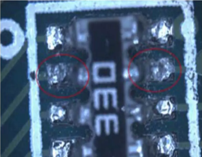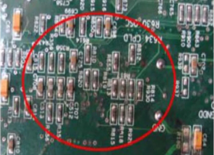 2. 一批PCBA在运行了一段时间后出现了4块因电阻排焊盘和焊点发暗而导致电路工作不正常,如图2所示。