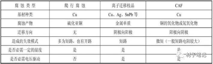 马里兰大学较早研究了翼型引脚器件上的爬行腐蚀,并对腐蚀机理进行了初步的探讨。与离子迁移枝晶、CAF类似,爬行腐蚀也是一个传质的过程,但三者发生的场景、生成的产物及导致的失效模式并不完全相同,具体对比如表2所示。