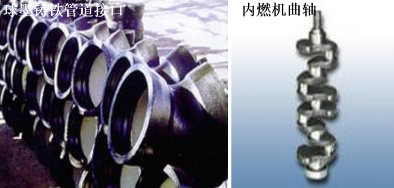 名称及含义:最低抗拉强度为150MPa灰铸铁。 成分:Wc=2.7%~3.6%,Wsi=1.0%~3.0%,WMn=0.4%~1.2%,Wp<0.3%,Ws<0.15%。 性能:良好的铸造性能、切削性能,较高的耐磨性、减震性及低的缺口敏感性。 用途:用于承受中载荷的铸件,如底座、床身、工作台等。 名称及含义:最低抗拉强度为400MPa最小断后伸长率为18%的球墨铸铁。 成分: Wc=3.6%~3.9%,Wsi=2.0%~2.8%,WMn=0.6%~0.8%,Ws<0.04%,Wp<0.1%,WMg=0.03%~0.05%。 性能:具有很高的强度,又有良好的塑性和韧性。综合力学性能接近于钢,铸造性能好. 用途:用以制造受力复杂、负荷较大和要求耐磨的铸件。