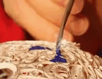 烧蓝是将整个胎体填满色釉后,再拿到炉温大约800℃的高炉中烘烧,色釉由砂粒状固体熔化为液体,待冷却后成为固着在胎体上的绚丽的色釉,此时色釉低于铜丝高度,所以得再填一次色釉,再经烧结,一般要连续四五次,直至将纹样内填到与掐丝纹相平。