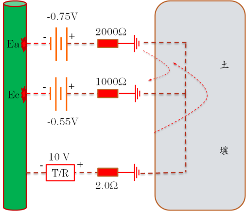 如图2所示,在没有外部电源时,管道表面存在电位的差异,在电位较负的位置(阳极),电流流出管道,在电解液中流向电位较正的部位(阴极),电位较负的位置为阳极,发生腐蚀。施加外部电流后,外部电流最开始时流向管道表面电位较正的部位(阴极),随着电流的流入,该部位电位负向偏移,从管道阳极部位流过来的电流逐步减小,随着阴极电位的负向偏移,从阳极流过来的电流最后为零。当外部施加的电流足够大时,电流将通过原来金属表面的阴极部位和阳极部位都流入金属管道,金属表面各点都成为吸流点,都成为阴极,得到了阴极保护。