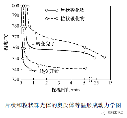 在钢的成分相同的情况下,钢的原始组织越细,原始组织中的碳化物分散度越高,相界面就越多,形核率越大。同时,珠光体的片间距越小,碳原子的扩散距离越小,奥氏体中的浓度梯度增大,奥氏体形成速度加快。例如,原始组织为托氏体时奥氏体的形成速度比索氏体和珠光体都快。另外,珠光体中的碳化物有片状的,也有粒状的。由于片状珠光体中的碳化物与铁素体的相界面面积大,易于形核,也易于溶解;同时,片状珠光体转变为奥氏体时,受碳在奥氏体中的扩散控制,而粒状珠光体转变时受碳在铁素体中的扩散控制。因此,碳化物呈片状时,奥氏体的等温形成速度较粒状的快。下图所示为ωc=0.9% 钢的片状和粒状珠光体的奥氏体等温形成动力学图,由图中可见,760℃时片状珠光体的奥氏体化转变完了时间不足 1min,而粒状珠光体则需 5min 以上。