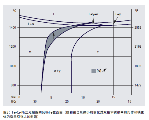 Fe-Cr-Ni合金三元相图是双相不锈钢冶金行为的指路图。从铁含量为68%处的三元截面图(图3)可看出:这些合金以铁素体(a)相凝固,然后随着温度的下降,部分铁素体转变成奥氏体 (g)(取决于合金成分)。当从固溶退火温度水淬时,在室温下可获得大约50%铁素体和50%奥氏体的金相组织。增加氮含量可提高铁素体向奥氏体转变的起始温度,并改善双相不锈钢尤其是热影响区的结构稳定性。