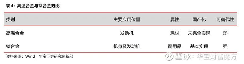 4、可被替代的难易程度不同:从材料性质看,高温合金强度、韧性、耐高温性和加工等综合性能优于钛合金,可替代性弱。而近年碳纤维等复合材料快速崛起,或可部分替代钛合金。应用战略地位的高度有所差异,高温合金长期应用的战略地位相对巩固。