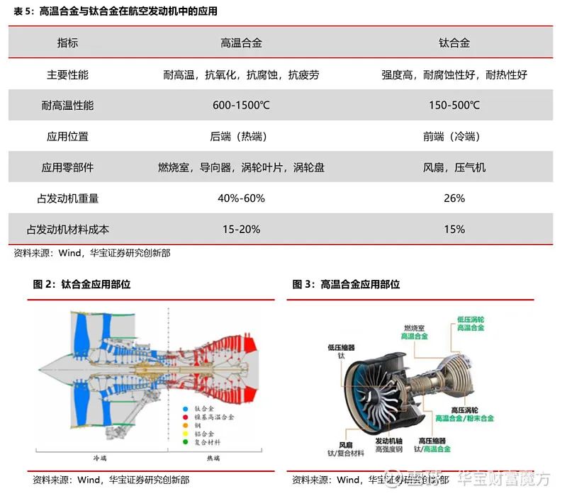1、应用位置不同:钛合金需求在机身结构件和发动机都有应用,包括机身关键结构件、,发动机结构件和转动件等,另外先进发动机钛合金叶片风扇和压气机占比达到40%;高温合金则侧重于发动机发动机结构设计和制造,工艺极其复杂,,导致其需求周期往往略偏滞后,同时发动机维修价值较高,且寿命短于机身,维修和更换的需求叠加会放大高温合金需求景气的持续性;