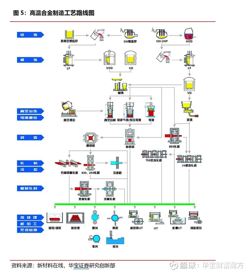 经过50多年发展,我国已经形成了比较先进,具有一定规模的生产基地。结合产业链各个环节相关参与方来看,目前我国生产厂商集中在航空航天领域用量最大的变形高温合金冶炼和锻造环节,因此在大批量生产高温合金母合金、板、棒、锻材上有很大的优势。