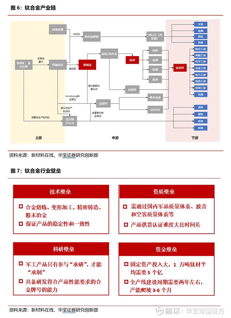 钛合金的制备工艺较高温合金简单,难点集中在海绵钛和钛材的制备。钛材产业链的核心壁垒不在于上游资源和中游冶炼,而是在于钛材的加工能力,尤其是高端钛材的研发能力和制造工艺。钛合金加工壁垒高筑,导致综合壁垒亦较高,催生近乎双寡头竞争格局。尽管原料金属钛价远低于镍,但是基于钛合金后端加工工艺复杂,最终部分钛合金产品价格与高温合金价格相当,甚至略高一筹。