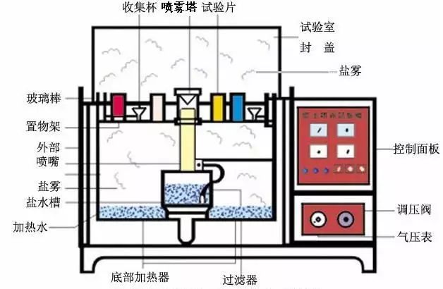 人工模拟盐雾环境试验是利用一种具有一定容积空间的试验设备——盐雾试验箱(如图),在其容积空间内用人工的方法,造成盐雾环境来对产品的耐盐雾腐蚀性能质量进行考核。