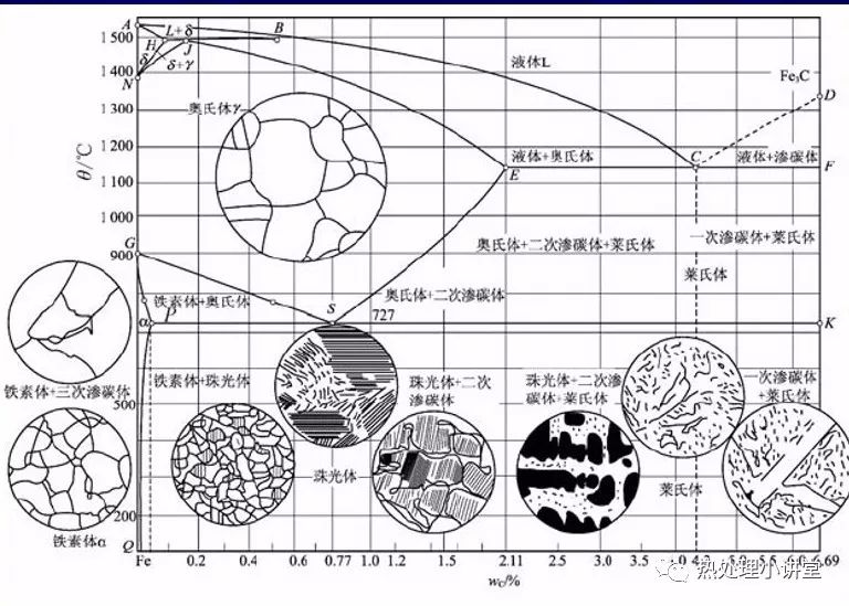 (上图为铁碳相图各阶段对应的金属组织)