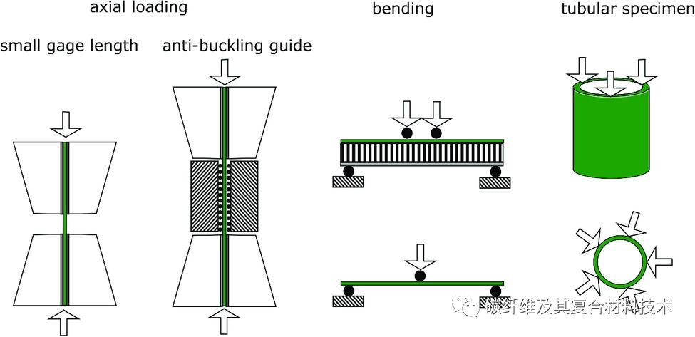 这些测试策略是静态压缩测试的既定方法,有时也用于疲劳测试。然而,这两种方法中的夹具数量都很多,只有一些夹具可以进行疲劳测试。这些普遍接受的压缩试验方法由不同的试样几何形状或加载条件补充。下图中概述几张常见的压缩测试的概念装置。