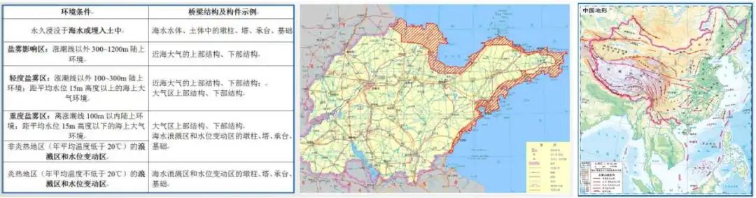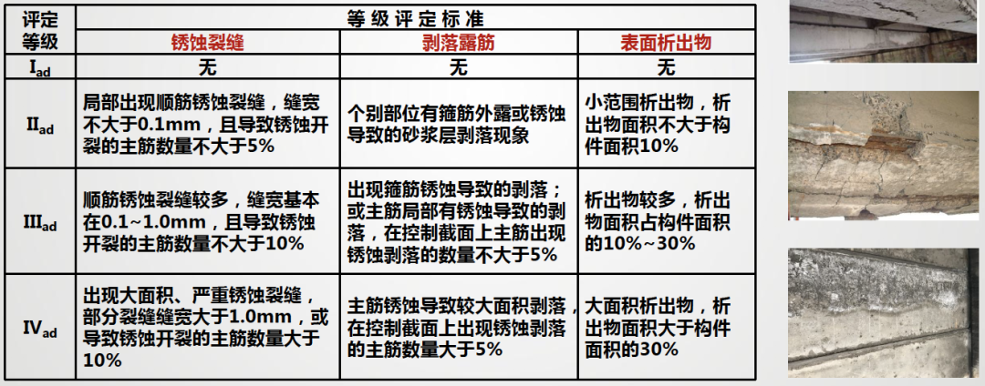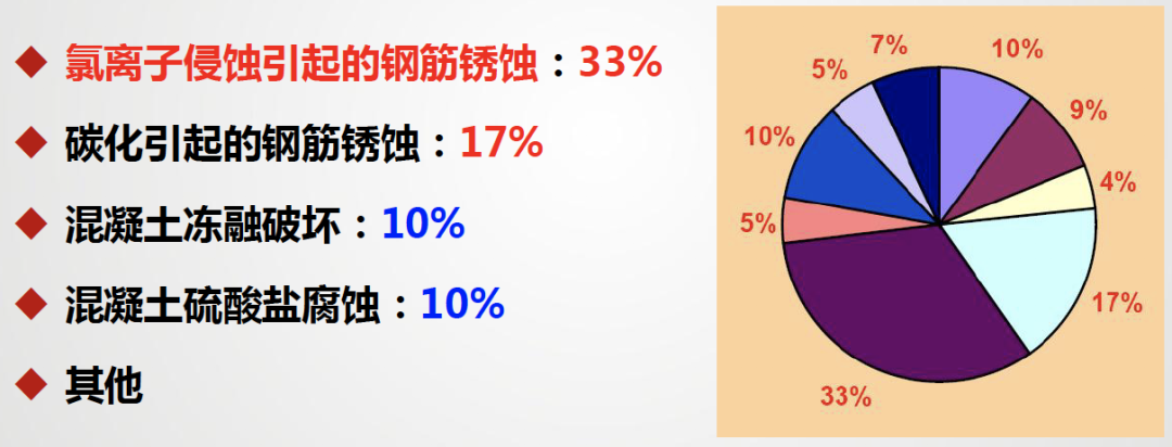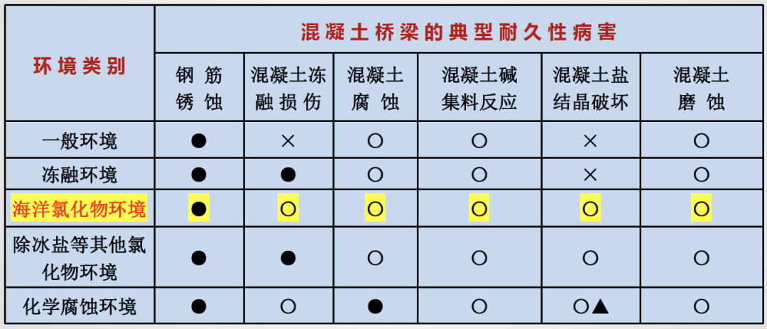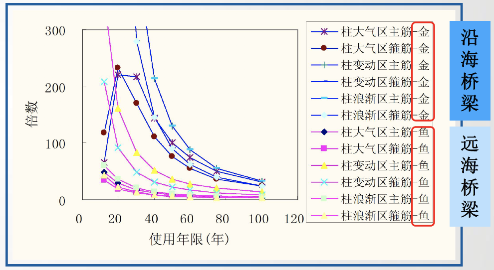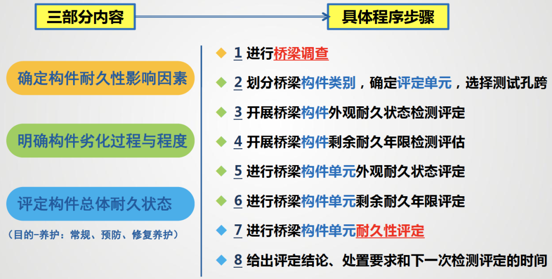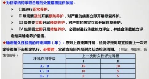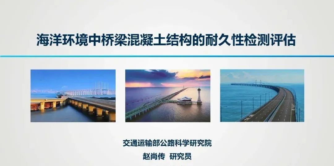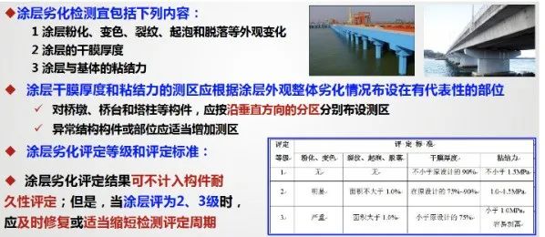 环境特点与耐久性现状 (一)海洋环境的特点 ◇ 氯盐:腐蚀钢筋; ◇ 硫酸盐、镁盐:腐蚀混凝土; ◇ 劣化特征:钢筋锈蚀;混凝土结构表面疏松露骨、锈胀开裂; ◇ 同一混凝土桥梁,在相同使用年限内,海洋环境中氯离子诱发钢筋锈蚀的可能性是一般大气环境中混凝土碳化导致钢筋锈蚀的几百倍。 ◇ 海岸线附近1~2公里范围内及近海海域基本上都属于海洋环境。(山东海洋总体规划区域) (二)耐久性现状 ◇ 部分沿海桥梁,耐久年限非常短,通常在10~20年左右即出现钢筋锈蚀现象; 3. 我国混凝土桥梁耐久性总体呈现阶段性特点 我国公路桥梁总体耐久性良好,但也存在阶段性特点和部分耐久性不足现象。桥梁耐久性问题需要引起重视。 (三)耐久性不足的危害 耐久性是保障公路桥梁安全耐久使用的重要性能,是第一道屏障; 海洋环境对桥梁混凝土结构和钢结构都是一种恶劣的环境,在养护中应加以重视。 外观耐久状态检测 (一)海洋环境中混凝土桥梁的典型耐久性病害 耐久性降低的表现形式 ◇ 耐久性病害可以分为两大类:可以目视发现的和不能发现的,这两者都可以导致构件性能的保持能力降低,或者说,是性能保持能力降低的具体体现。 • 目视可以发现的是外观耐久状态,分为两种: 1)一是耐久性降低导致结构构件表面发生明显可视变化,即外观劣化; 2)二是结构构件防护或保护措施不足在结构构件表面的表现,即质量缺陷; • 目视不能发现的是结构或构件材质性能在环境作用下的潜在性能劣化,这需要通过检测分析、预测保持结构或构件性能不降低的潜在性能劣化的时间。这个时间即为剩余耐久年限。 (二)构建外观耐久状态检测评定方法 1. 评定标准 ◇ 外观耐久状态评定可分为外观质量缺陷评定和外观劣化度评定 ◇ 以两者中差者等级作为外观耐久状态评定等级 2. 检测评定指标 ◇ 混凝土构件外观质量缺陷指标宜包括非锈蚀裂缝、蜂窝及麻面、孔洞; ◇ 钢筋锈蚀导致的外观劣化度检测指标宜包括锈蚀裂缝、剥落露筋和表面析出物; 3. 构件单元等级评定 剩余耐久年限预测 (一)构件剩余耐久年限检测评估思路 估算思路:剩余耐久年限可采用劣化模型法或时间外推法进行计算。 (二)海洋环境中混凝土构件剩余耐久年限预测方法 (三)构件剩余耐久年限检测与估算过程 (四)构件单元剩余耐久年限评定 环桥梁耐久性检评程序 耐久性检测评定程序 1. 桥梁调查 ◇ 桥梁调查内容:资料、桥位环境和外观;必要时尚应进行构件材料成分分析。 1)资料调查:桥梁设计文件和竣工资料、桥梁服役历史、桥梁检查和维护资料; 2)现场使用环境调查:桥梁所处环境作用类别、作用等级和结构构件局部环境以及交通流量等; 3)外观调查:初步确定构件表观耐久性状况,支撑构件评定单元划分; ◇ 在桥梁调查过程中,应确定桥梁耐久性主要劣化形式、劣化机理和劣化发展情况。 2. 划分构件类别,确定评定单元 3. 确定评定单元中检测构件数量 ◇ 公路桥梁耐久性评定单元中的构件可全数检测,也可抽样检测,并应符合下列规定: 1)当评定单元中的构件数量不超过3个时,应采取全数检测方式; 4. 开展构件评定单元耐久性检测评定 采用外观耐久状态和剩余耐久年限相结合的办法(前述二、三) ◇ 当不能定量估算构件剩余耐久年限时,可采用外观耐久状态等级作为耐久性等级; ◇ 当构件有表面防护涂层等防护措施时,宜对涂层劣化状态保护效果进行检测评定。 涂层劣化状态的检测评定
