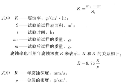 腐蚀率是指将试样置于试验介质中,经一定时间后测量其重量变化所求得的材料的全面腐蚀 (即均匀腐蚀)速度。腐蚀率可用单位时间、单位面积上的质量损失来表示,计算公式如下: