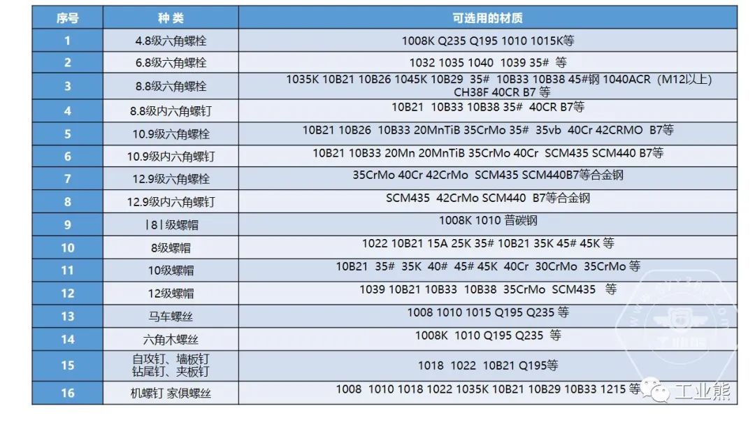常用钢质连接用螺栓性能选用材料一览表: