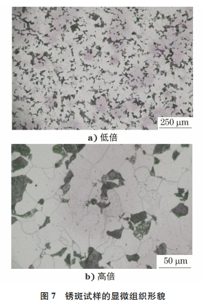 将试样腐蚀后进行冲水,等待1min后再擦拭试样表面并吹干,将试样置于光学显微镜下观察,结果如图7所示。由图7可知:试样表面分布有大面积的锈斑,锈斑呈独立的小区域,边界较为模糊;锈斑呈铁锈色,颜色暗灰,表面布满麻点,锈斑未沿晶界分布,大部分是贯穿晶粒的。说明锈斑不是导致灰晶粒形成的原因。