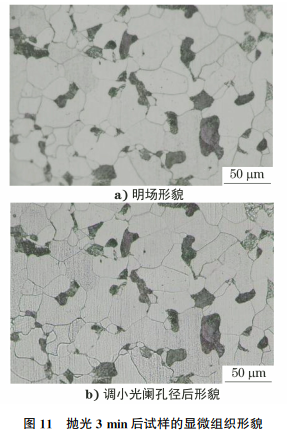 抛光3min后试样的金相检验结果如图11所示。由图11可知:试样表面基本没有粗大划痕,残余较多的细长划痕,方向沿竖直方向,该划痕为抛光划痕;将光阑孔径调小后发现已有部分铁素体晶粒呈白色,灰色晶粒也变得较浅,且晶粒表面划痕越深,颜色越灰。