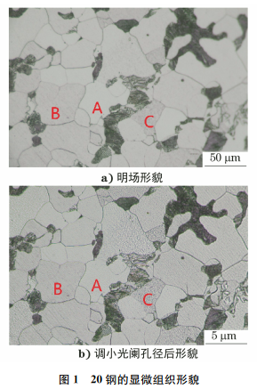 采用尺寸为15mm×18mm(直径×长度)的20钢标样。将20钢标样依次用320,600,1000,1500,2000目的碳化硅砂纸进行预磨机磨制,预磨机的转速为700r/min,直到划痕均匀统一;然后依次用粒度为0.5μm和2.5μm的金刚石磨粒抛光膏对试样进行抛光,抛光机的转速为1400r/min,加水间隔时间为20s,抛光时间为6min;用4%(体积分数,下同)硝酸乙醇溶液腐蚀试样7s;最后,将试样置于光学显微镜下观察,结果如图1所示。