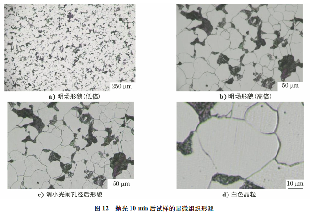 使用粒度为2.5μm的抛光膏对 试样抛光2min,以去除粗大划痕,再使用粒度为0.5μm的抛光膏对试样轻抛8min,抛光10min后试样的金相检验结果如图12所示。由图12可知:大部分铁素体呈亮白色,灰晶粒非常少,放大观察发现试样已没有明显划痕;将光阑孔径调小后发现亮度几乎没有变化,只有极少灰晶粒的表面变暗,说明试样表面已十分平整,光源亮度对其观察结果影响不大;放大观察其中的白色晶粒,发现其表面有沿竖直方向十分细小的划痕,分布较为均匀,判断其是抛光划痕。综合上述分析发现,当抛光划痕足够细小时,铁素体呈亮白色,可以避免晶粒发灰。