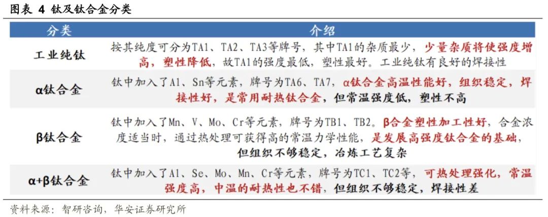钛的材料强度和加工难易很大程度上取决于钛的纯度,纯度越高,加工越容易,但强度越低。在钛中加入其他元素制成钛合金可获得更佳的性能。根据纯度及添加元素不同,钛及钛合金又具体可分为工业纯钛,α钛合金、β钛合金及α+β钛合金。其中α+β是双相合金,组织稳定性好,有良好的韧性、塑性和高温变形性能,能较好地进行热压力加工,能进行淬火、时效使合金强化。α+β钛合金力学性能变化范围较宽,可适应各种用途,约占航空工业使用的钛合金70%以上。目前国内外应用最广泛的α+β钛合金是Ti-Al-V系的Ti-6Al-4V,即TC4合金。