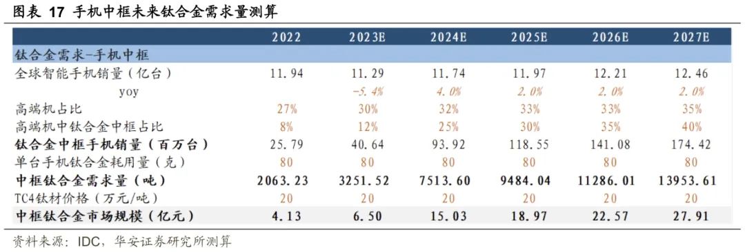 以手机中框为例,我们来测算一下钛合金未来的需求量。目前,钛合金已实现批量化应用于手机中框(如IPhone 15Pro),且目前中框钛合金用量在3C产品中最大(单台手机中框所需消耗钛合金坯料约80 g),故我们以手机中框为例测算2027年所需钛合金及其市场规模,主要假设有:(1)假设智能手机出货量保持小幅平稳增长,2025-2027年的年均增速为2%;其中高端手机渗透率、高端手机钛合金中框渗透率持续提升;(2)单台手机中框所需钛合金坯料为80g,且主要采用TC4合金,TC4合金均价保持20万元/吨。以此测算可得出,2027年手机中框钛合金需求量约1.4万吨,对应市场规模为28亿元。
