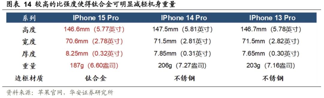 我国钛材及上游海绵钛产量持续增长。根据美国地质调查局,我国海绵钛(钛加工材上游重要原材料)产量稳步增长,占全球产量比例不断提升,2022年全球海绵钛产量26万吨,我国海绵钛产量15万吨,占比57.69%。根据中国金属通报,我国钛加工材产量由2000年的0.22万吨提升至2022年的15.27万吨,产量CAGR为21.2%。钛合金可满足3C电子减重、坚固、耐磨等多重需求。钛合金比强度高、密度小、耐腐蚀及生物兼容性高,用于3C电子可提升其坚固耐用性能同时具备轻量化属性。目前已有部分机型及穿戴设备在边框、背板、铰链等使用钛合金,如IPhone 15pro系列、AppleWatch Ultra、小米15pro钛系列、三星Watch 5pro、荣耀Magic V2折叠屏等。(1)坚固、耐用兼顾减重:以IPhone 15Pro系列为例,其所使用的TC4(Ti-6Al-4V)钛合金为α+β型钛合金,TC4钛合金也是目前使用量最大的钛合金,约占钛合金总产量的50%以上,具有良好的热强性、耐蚀性和低温韧性,广泛应用于火箭壳体和航天器等航空航天领域,故保证了产品的坚固耐用程度。同时由于添加了铝,进一步减小合金密度,使得产品重量变轻。通过对比IPhone 15Pro与IPhone 13/14Pro(使用不锈钢边框)系列,15Pro重量为187 g,13/14Pro重量分别为203和206 g。钛合金中框可在提升产品坚固程度的同时减轻机身重量。(2)良好生物相容性:部分金属元素容易与人体汗液中的盐离子反应,使得金属元素更加活泼(离子化),渗透入皮肤后引发金属过敏的成分,常见易引发金属过敏的元素有镍、钴、铬。钛合金与人体组织和血液相容性好,为亲生物金属,可在医学上以钛制成人造骨骼植入体内,用钛合金制作产品外壳可避免金属过敏。(3)美观,不留指纹:钛合金硬度高,热形变小,耐腐蚀,且为亲生物金属,故而保证手机或手表外壳不易变形、划伤、磕碰与褪色,不留指纹,增强产品美观度。