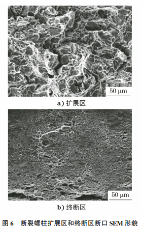 由图6可知:断口扩展区以沿晶断裂为主,并有少量韧窝;终断区呈韧窝个别撕裂特征,面积非常小,该断口呈典型的脆性断裂特征。