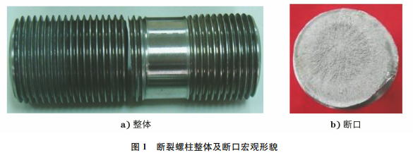 国内某核电厂安全喷淋泵外筒体与底板连接螺柱在安装完成20h后断裂。该螺柱材料为X6CrNiCu17-04时效硬化马氏体钢双头螺柱,规格为M36×110mm。该批螺柱按规定进行了固溶加时效处理,其中固溶温度为1050℃,保温时间为4h,油冷;时效硬化处理温度为(610±5)℃,保温时间为4h,空冷。固溶、时效硬化温度曲线均符合规范要求。研究人员采用宏观观察、化学成分分析、力学性能测试、金相检验、扫描电镜(SEM)和能谱分析等方法对该螺柱的断裂原因进行分析,以防止该类问题再次发生。