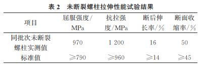 选取同批次未断裂螺柱进行室温拉伸试验,加载位移速率为2mm/min,试验精度为±0.5%。同批次试样的室温拉伸试验结果如表2所示。由表2可知:同批次试样室温抗拉强度和屈服强度满足RCC-MM5110标准对X6CrNiCu17-04钢材料的要求,其中屈服强度和抗拉强度较高,分别达到了970MPa和1200MPa,断后伸长率和断面收缩率满足标准要求,但裕度不大。