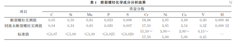采用ICP-AES型电感耦合等离子体原子发射光谱仪对断裂螺柱进行化学成分分析,结果如表1所示。其中采用惰性气体熔融热导法测量氢元素,从螺栓上取约1g试样,浸在四氯化碳溶液中,之后用超声波清洗试样,风干后将试样放入经脱气的石墨坩埚中,在质量分数为99.99%以上的氩气保护下加热熔融,释放出的氢气分子进入载流气体中,经色谱柱与气体分离后,在热导池中进行检测,根据热导率的信号变化,计算出氢含量。由表1可知:该批螺柱的化学成分均符合RCC-MM5110《压水堆核岛机械设备设计和建造规则》的要求,尤其是S、P等有害杂质元素的含量均满足标准要求,但氢含量较高,断裂螺柱中H的质量分数达到了0.00046%,明显偏高,也显著高于未断裂螺柱中氢的质量分数。
