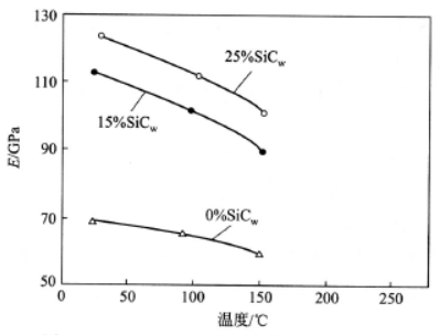 SiCw/Al复合材料的性能见表6、表7,SiCw/Al复合材料强度与SiCw体积分数之间的关系见图6,SiCw/2024Al复合材料强度、弹性模量与温度的关系见图7和图8。可见,与基体合金相比,复合材料的强度、模量都有显著提高,且高温性能优良,但密度稍有增加。复合材料的强度随晶须的体积分数的增加而增加,而且其性能与制备工艺方法及参数也有很大关系。