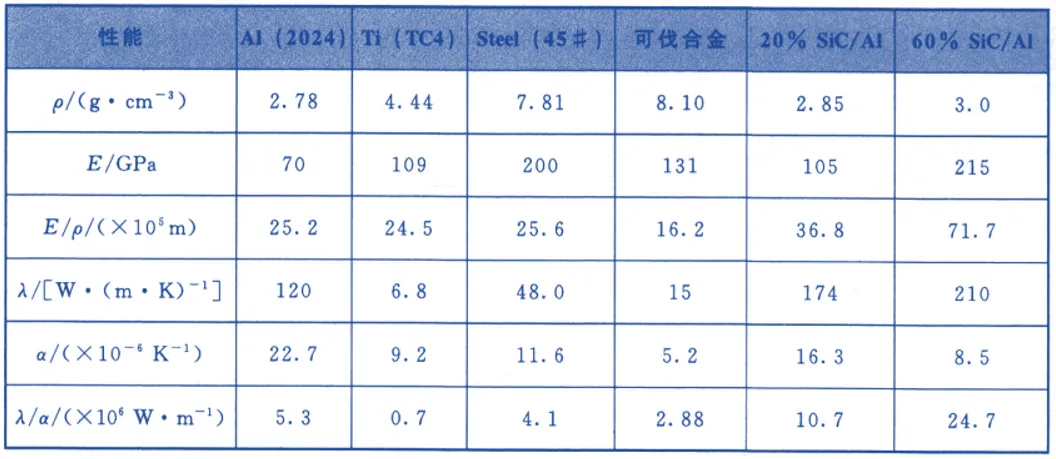 表4 SiCp/AI复合材料与其他常用金属材料的性能对比