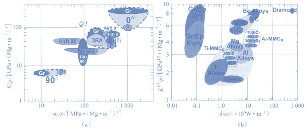 SIC/Al复合材料相比于其他金属材料,具有低的密度、高的比强度和比刚度、优异的热导率和低的热膨胀系数,使其在航天飞行器的减重和高性能化方面具有显著的竞争优势。研究表明,复合材料的可设计性,可以使 SiC/Al基复合材料的比刚度(35~40 GPa/(g·cm-3))远高于包括铝合金、钛合金、镁合金、镍基高温合金及钢等传统结构材料(这些材料的比刚度为 (25~32 GPa/(g·cm-3)),介于纤维树脂基复合材料纵向与横向性能之间,所以,高性能 SiC/Al复合材料是实现先进航天飞行器轻量化的理想材料。