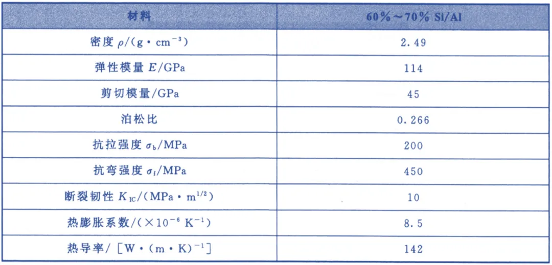 硅颗粒增强铝基复合材料以Si颗粒作为增强体,与 SiC颗粒相比,其硬度和强度都低一半以上,直接强化作用并不显著,Si/Al复合材料作为承力件使用并没有优势。多数情况下 ,Si颗粒充当功能体的角色,起到降低热膨胀系数、提高热导率和弹性模量的作用,并且 Si颗粒硬度较低,易于机加工,适于进行仪表级精密加工;材料还具备良好的表面涂覆工艺性、激光焊接工艺性。