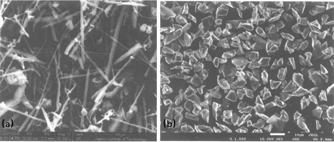 图5 a)SiCw晶须扫描电镜照片;b)SiCp扫描电镜照片