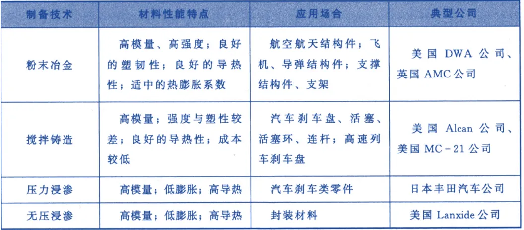 国际上围绕影响复合质量的SiC增强体与AI合金基体之间界面结合、颗粒分布均匀性及组织与缺陷的控制等关键共性问题开展了大量系统的复合制备技术专门研究,形成了以制备高性 能碳化硅/铝复合材料的粉末冶金法、低成本的搅拌铸造法、高体积分数复合材料的浸渗法为代表的性能可控、强化作用显著的复合制备方法,并在工业上根据使用需求得到了不同程度的应用。表1给出了与制备方法相应的材料的性能特点及应用场合,表2总结了国外不同公司制备的复合材料的性能。