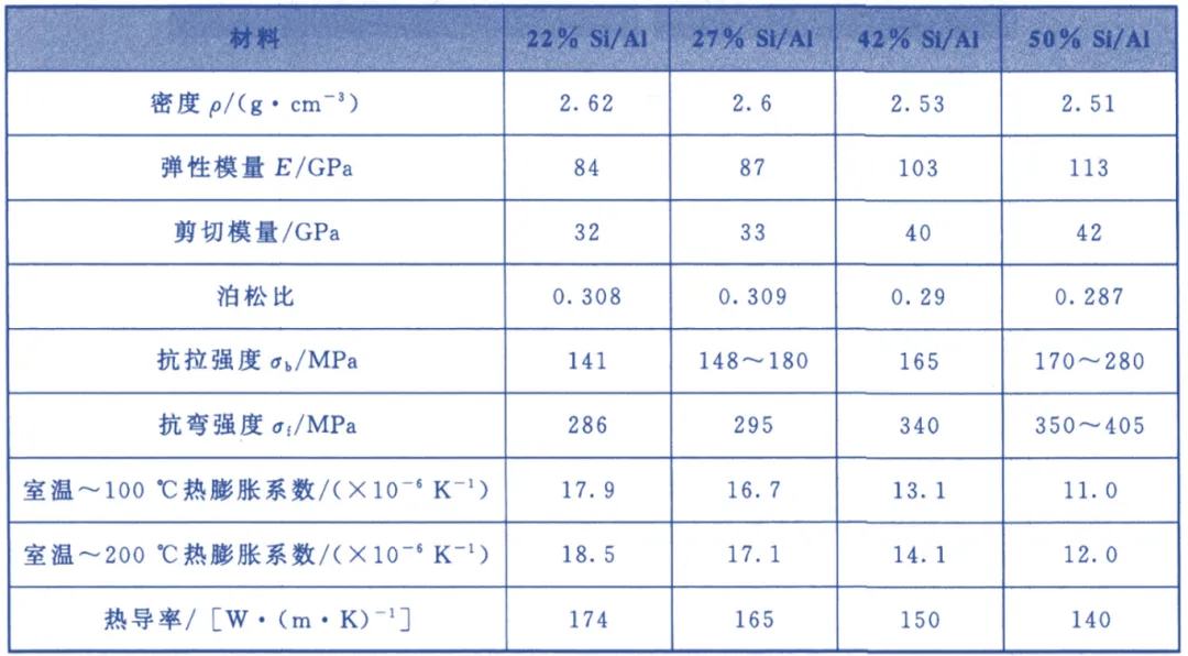 表7 电子封装用Si/Al复合材料的典型性能