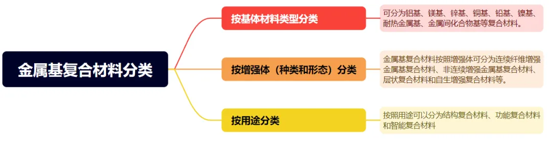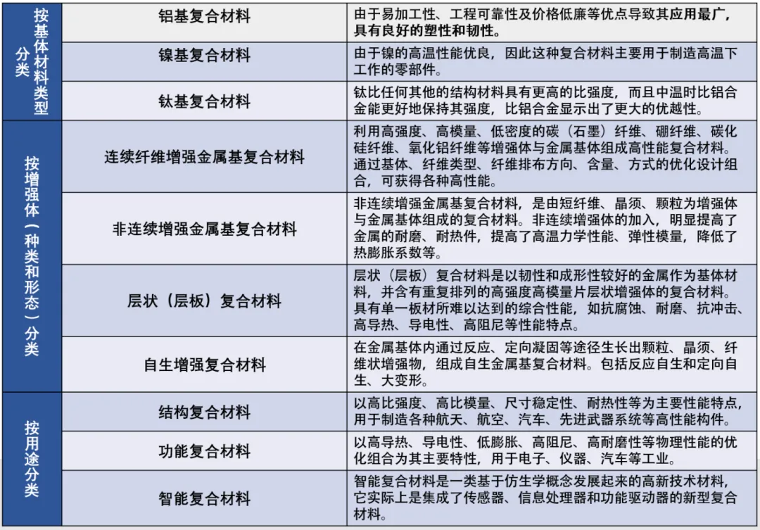 金属基复合材料具有高的比强度、比模量、耐高温、耐磨损以及热膨胀系数小、尺寸稳定性好等优异的物理性能和力学性能,克服了树脂基复合材料在宇航领域中使用时存在的缺点,得到了令人瞩目的发展,成为各国高新技术研究开发的重要领域。除力学性能优异外,还具有某些特殊性能和良好的综合性能,应用范围广。此外,金属基复合材料品种繁多,有各种分类方式,以下从基体、增强体以及用途三方面进行分类。